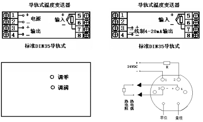 對導軌式溫度變送器輸入可以是熱電偶、熱電阻、標準信號。工作電源接端子1、2,4~20mA輸出信號接3正、4負;對二線制4~20mA輸入信號正接5、負接6;熱電阻單端A5、并聯(lián)端BC分別接6、7。