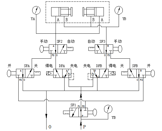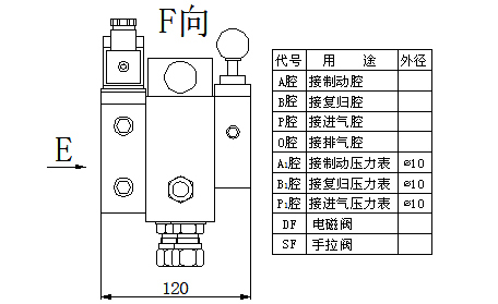 自動(dòng)剎車:電磁閥線圈處于失電狀態(tài),手拉閥SF1、SF2、SF3往里推至自動(dòng)狀態(tài),過(guò)濾后壓縮氣體從進(jìn)氣腔(P腔)進(jìn)入集成塊。當(dāng)接收到停機(jī)指令時(shí),制動(dòng)電磁閥DFA得電開(kāi)閥,使壓縮氣體進(jìn)入制動(dòng)腔(A腔), 從而實(shí)現(xiàn)對(duì)制動(dòng)器的投入, 加速機(jī)組的制動(dòng)停機(jī);